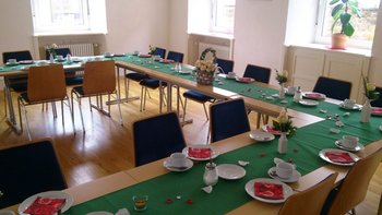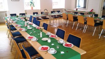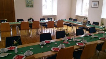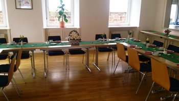 Der Raum bietet ca. 60 Personen an gedeckten Tischen Platz, oder 100 Personen in Stuhlreihen.