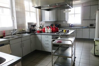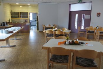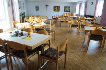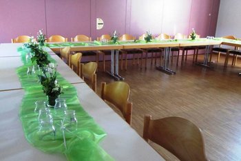 Das Pfarrheim bietet für ca. 100 Personen Platz. Der Raum kann mit einer Trennwand abgeteilt werden. Dann ist im vorderen Bereich (Thekenbereich) für ca. 45 Personen Platz. Die Küche ist voll ausgestattet.