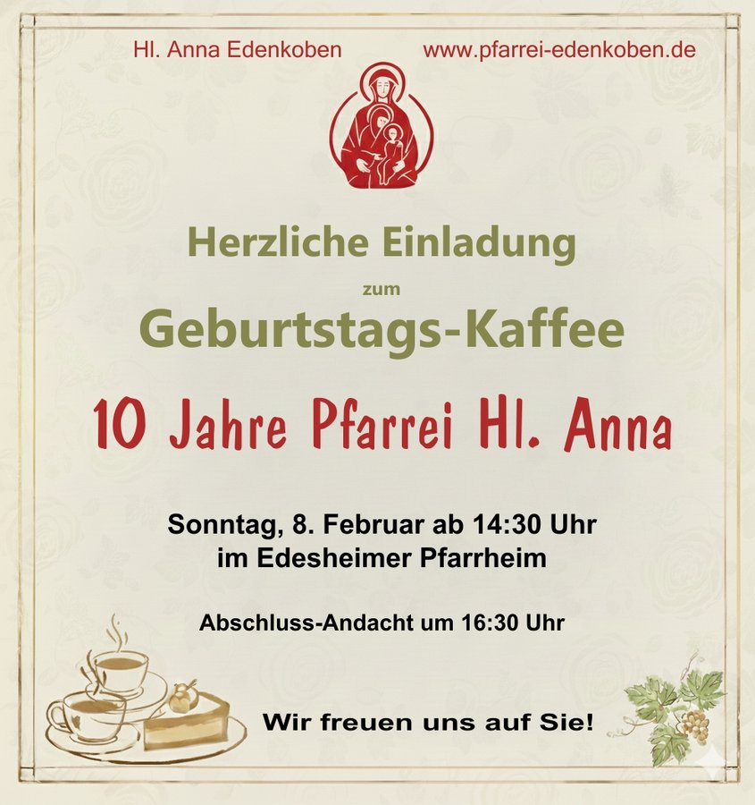 Aus diesem Anlass laden wir alle Interessierten am 8. Februar 2026 ab 14:30 Uhr zu einem „Geburtstagskaffee“ ins Pfarrheim nach Edesheim ein. In geselliger Runde blicken wir zurück auf die vergangenen 10 Jahre. Verschiedene Impulse nehmen uns mit auf diesem Nachmittag der Erinnerung. Wir freuen uns dabei auf die Teilnahme vieler Pfarreimitglieder und auch auf möglichst viele unserer aktiven und ehemaligen Hauptamtlichen. Der Nachmittag endet um 16:30 Uhr mit einer Dankandacht.