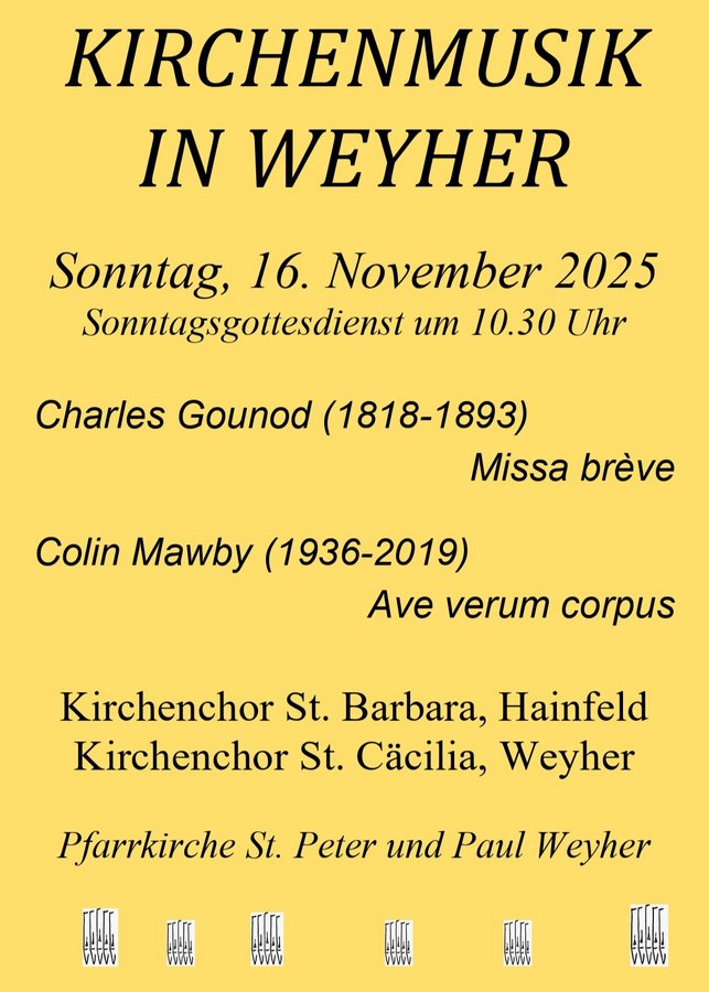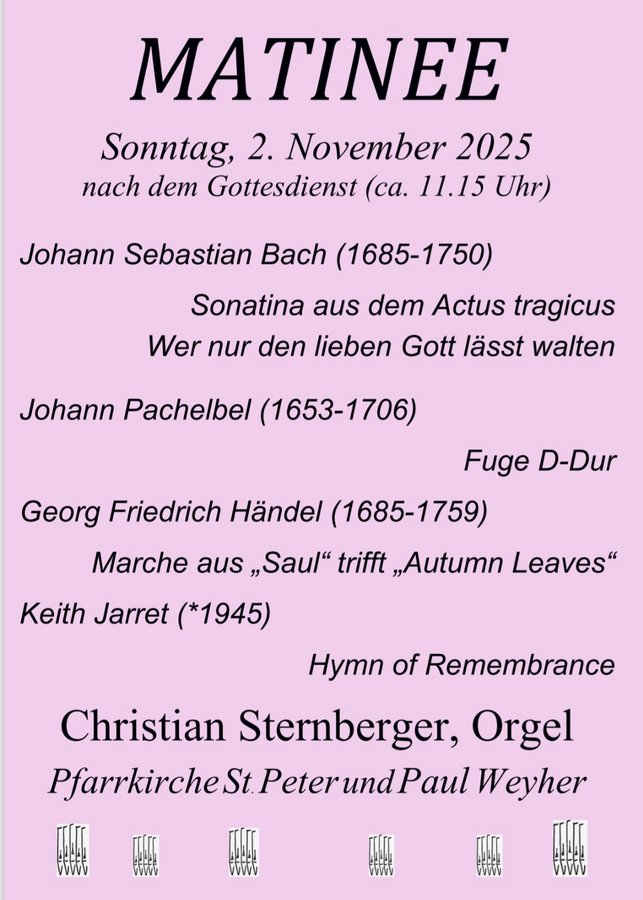 Herzlichen Einladung zur Orgelmatinee in Weyher am 02.November 2025, im Anschluss an den Gottesdienst, ca. 11:15 Uhr.